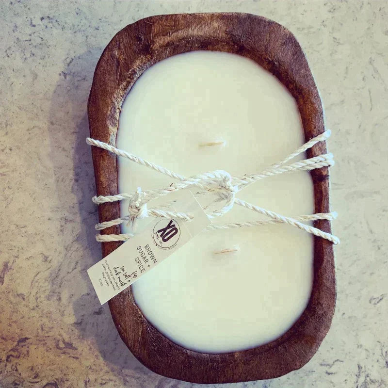 Wood dough bowls are handmade and gorgeous. While they're all somewhat similar in size and shape, they're all very unique. This means that your dough bowl won't look like any others. It also means that the poured wax will be somewhere between 12 and 16 ounces (a potential variance of about a half-cup of wax). On average, these bowls measure 9" x 6" x 2".