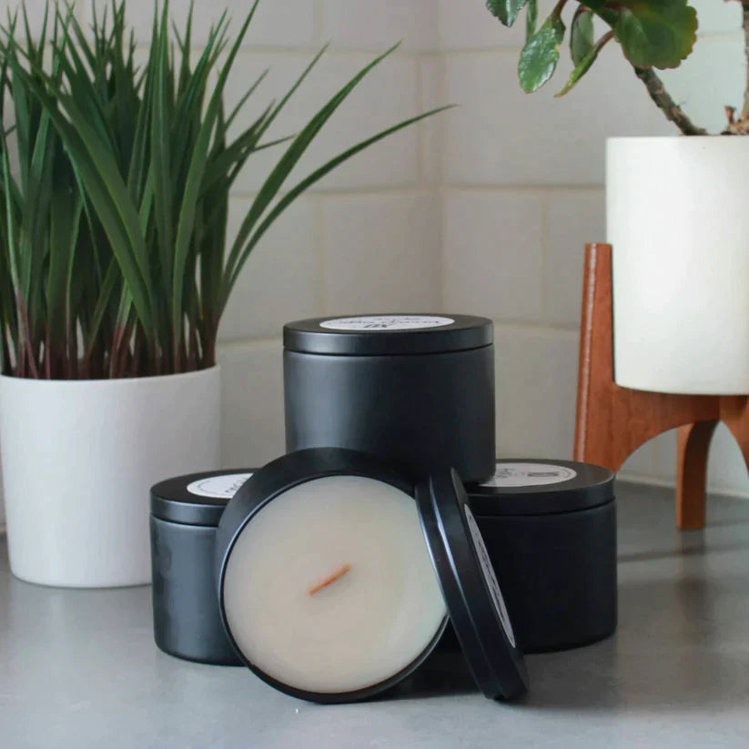 These cuties are perfect to throw in your bag when you travel, or are great at home in a bathroom or smaller space - or when you just want a lighter scent. Travel tins have a matte black finish and are about 8 ounces.